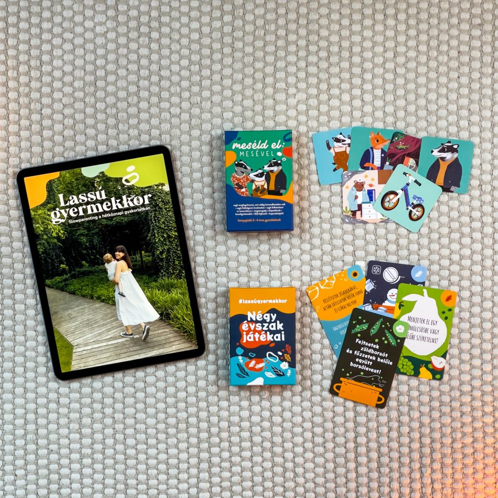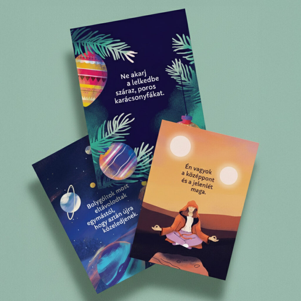 Szia Zsuzsi! Szeretnék visszajelezni! Mi idén korán (22-én) tartottuk itthon szűk körben a „kiskarácsonyt”, a te kártyacsomagjaid is a fa alá kerültek. Nem elsőre kerültek felfedezésre – méretéből adódóan a hatalmas duplos doboz élvezett elsőbbséget, viszont mikor odaért a nagyfiam (3,5 éves), és kipróbáltuk, és teljesen elvarázsolta. Mindketten mondtunk egy mesét, átbeszéltük a kártyák segítségével, hogy hogyan fog alakulni a nagy családozós, utazós karácsonyi banzáj. Este a fürdőkádban ülve beszélgettünk, és azt mondta, az volt a legjobb a napban, amikor a kártyákkal meséltünk, és kérte, hogy holnap is vegyük elő! Bevallom, egy kicsit „magamnak” vettem meg, nem igazán hittem, hogy azonnal rákap majd, de mosolyog a szívem, ha arra gondolok, hányféleképpen fogunk még kapcsolódni a kártyákon keresztül! Köszönjük szépen!