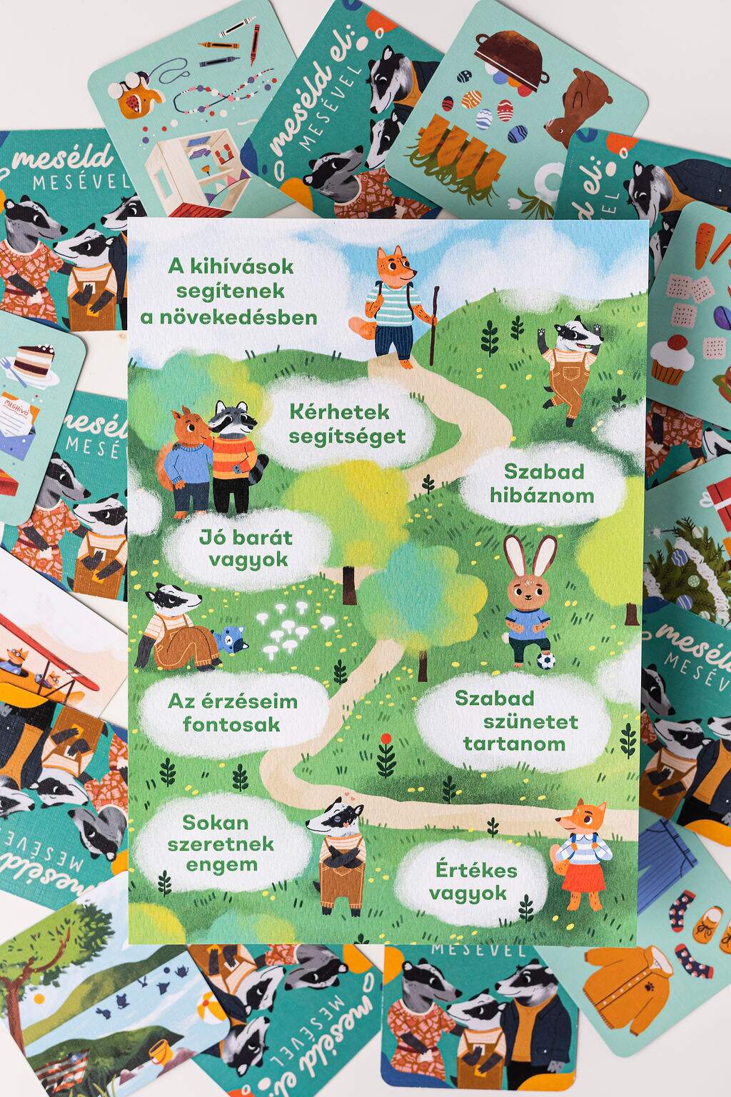 A Meséld el: mesével! EQ-fejlesztő kártyához kapcsolódva, az érzelmi nevelés további eszközeként megerősítő, támogató énüzeneteket gyűjtöttem össze egy grafikára. Az üzenetek a gyermek és szülő egyaránt olvashatja, vagy felolvashatja, hiszen a szülő hangja idővel a gyermek belső hangjává válik.